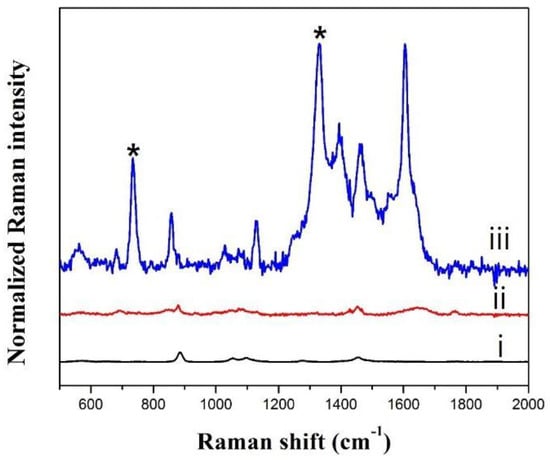Surface enhanced Raman scattering (SERS) spectra of (i) SiO2@Au@Ag NPs, (ii) 10 mM ATP, and (iii) SiO2@Au@Ag NPs in the presence of 10 mM ATP. The concentrations of SiO2@Au@Ag NPs were 1 mg/mL in ethanol solution, respectively.