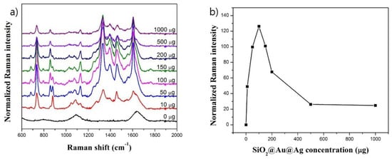 According to Ding et al., the mass and concentration of SERS materials may have significant effects on SERS performance [63]. Specifically, higher loading of silver increases the background signal of SERS, leading to decreased SERS signals. In this study, we performed SERS measurements of ATP (10 mM) with 10–1000 μg of SiO2@Au@Ag NPs. Figure 2 revealed that few SiO2@Au@Ag NPs could have been available as hotspots for SERS. Thus, a weak SERS signal of ATP was observed with 10 µg of the NPs. The SERS signals of ATP increased dramatically from 10 to 100 µg of SiO2@Au@Ag NPs, reaching a maximum value at 100 µg. However, the SERS signals of ATP with large amounts of SiO2@Au@Ag NPs (from 150 to 1000 µg) decreased dramatically because large number of NPs increased the background signal of the NPs and at the same time, decreased the number of ATP molecules adsorbed on the surface of the NPs. Therefore, the optimal amount of the NPs was set as 100 μg for further analysis.