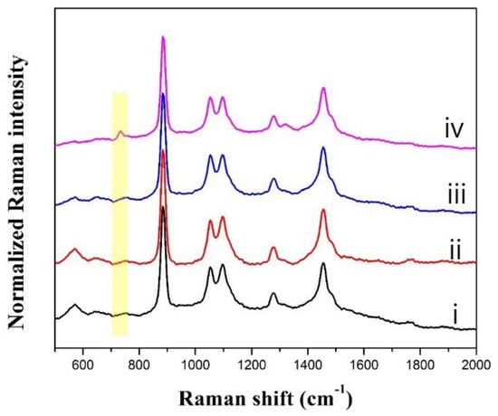 To investigate the effects of ATP-encapsulated liposomes on the SERS signal, ATP-encapsulated liposomes were incubated with SiO2@Au@Ag NPs in the presence of PBS containing 0.1% Tween 20 (PBST). As shown in Figure 3, ATP-encapsulated liposomes did not exhibit any SERS bands because of the low Raman signal of ATP without the metal surface (Figure 3ii). The SERS spectra of SiO2@Au@Ag NPs in the absence (Figure 3i) and presence of PBST (Figure 3iii) were the same, indicating that PBST did not affect the SERS spectrum of SiO2@Au@Ag NPs. However, when SiO2@Au@Ag NPs were incubated with PBST and ATP-encapsulated liposomes, the SERS band at 734 cm−1 was clearly observed because the Tween 20 broke down the structure of the liposomes and ATP was released into the solution. Subsequently, ATP was absorbed on the surface of SiO2@Au@Ag NPs, and subsequently, SERS bands appeared, as observed in Figure 3iv.