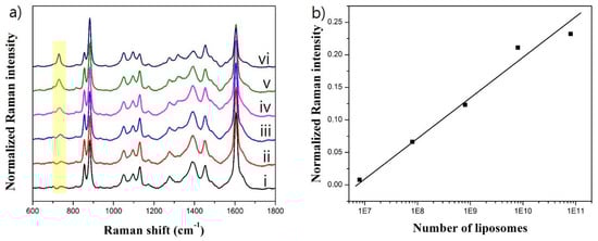 Finally, the effects of the number of ATP-encapsulated liposome on the SERS signal of SiO2@Au@Ag NPs were also assessed. The intensity of the SERS band at 734 cm−1 decreased as the number of liposomes decreased (Figure 4).
