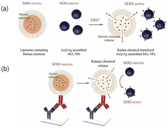 (a) Illustration of RLC-encapsulated liposome-enhanced SERS on Au@Ag-assembled silica NPs; (b) Suggested applications of RLC-encapsulated liposome-enhanced SERS-based immunoassays.