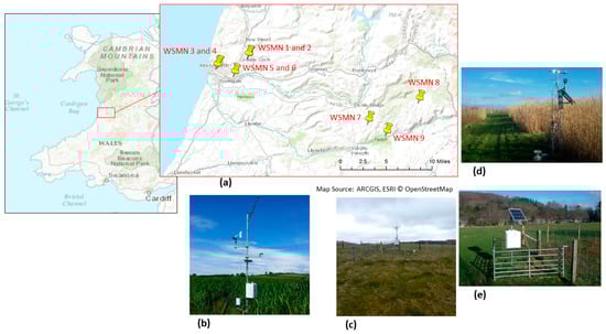 (a) Overview of the locations on which the WSMN experimental sites are installed to acquire SM, ST, and ancillary data. Examples of images of the sites from: (b) Penglais, (c) Pwllpeiran, (d) Cae-Canol (e) Comins-Coch.