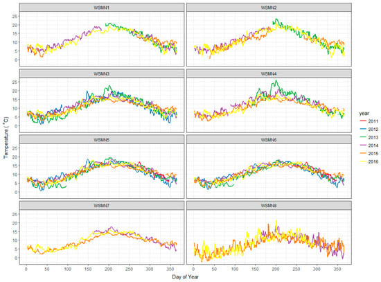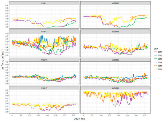 Another parameter that has been measured systematically at all sites is ST, which is also logged as a mean for each site specific recording interval (see Table 1) at the same depth where the soil moisture probes have been installed (i.e., ~5–10 cm below soil surface layer). Soil temperature data are required for temperature correcting the soil moisture sensors, which is built into the data logging programs. Figure 3 below summarises the ST measurements collected since the network was set up in 2011, derived from the daily averaging of the ST values. As can be seen, changes in ST follow the seasonal patterns at all sites with peaks occurring during summertime and lowest values observed during winter. Inter-annual variation is notable at all sites and is typically within a range of about 5 °C, the largest inter-annual variation can be seen at the highest altitude site (WSMN8) which also shows a wider day to day variation, likely driven by the harsher climate and highly organic soil.
