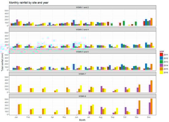 Cumulative rainfall is collected specifically at all sites at each individual site logging interval (15, 30, or 60 min) except at site 7 where, to date, only daily total rainfall is recorded. Sites 3 and 4 do not have their own dedicated rain gauge but are adjacent to the UK Met Office Gogerddan station where daily rainfall is available (http://www.metoffice.gov.uk). Rainfall is recorded by tipping bucket rain gauges (Young’s 52203-Sites 3–4, ARG100-Sites 5–6 and 7–8. CSI, Logan, UT, USA). Collected rainfall data is made available without the implementation of any pre-processing (e.g., for undercatch using different shelter correction factors depending on the exposure of a site to wind). Figure 4 below shows the total monthly rainfall acquired by site and year since WSMN was set up in 2011 until end of 2016. Of note is the large difference in the rainfall amounts reported between the lowland (sites 1–6) and upland sites (sites 7–8) with the rainfall in the uplands being significantly higher. Seasonally, similar trends are observed in terms of precipitation amounts between the sites 1–6 as a group and also separately for sites 7–8 as another group. This is mainly attributed to the difference in the elevation on which those groups of sites are located.