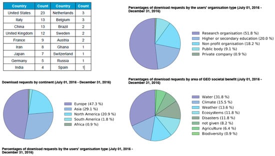 On the ISMN web site, data viewing is possible without registration, however, to acquire the data one needs first to register, a process that is fast and straightforward. The website provides all of the information required for interpretation of these data (including metadata), along with site photographs, maps, and descriptions. Due acknowledgment in any publication or presentation arising from use of these data is required. WSMN data collection is ongoing as of July 2011 for all WSMN sites, even though data from year 2009 is available for a small number of sites. The data base generated by WSMN is freely available for any research or scientific purpose or practical applications. So far, according to the ISMN download statistics, since the network set up in 2011 and until December 2016 data had been placed in total 366 requests for WSMN data download, which evidences a very good level of data dissemination already. An example of the WSMN data usage for the period 1 July 2016–31 December 2016 is shown in Figure 5.