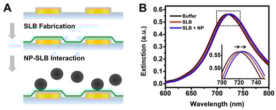 (A) Schematic illustration of supported lipid bilayer-coated (SLB-coated) nanodisk array for characterizing nanoparticle-SLB (NP-SLB) interactions; and (B) optical extinction spectra from localized surface plasmon resonance (LSPR) measurements show shifts in the λmax position after SLB fabrication (denoted as SLB) and subsequent interaction with silica nanoparticles (denoted as SLB + NP). Inset shows an enlargement of the area bound by the dashed rectangle.