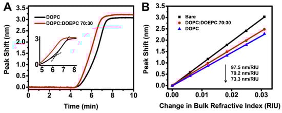Finally, we characterized the sensor resolution before and after SLB coating, which was defined as the smallest change in the bulk refractive index that produced a detectable change in the output and was determined by dividing the standard deviation of the temporal noise of the sensor output by the bulk refractive index sensitivity [105]. For a bare sensor, the practical resolution was calculated to be 6.67 × 10−5 RIU. After the fabrication of DOPC and DOPC:DOEPC 70:30 SLB coatings, the values were 7.23 × 10−5 RIU and 7.88 × 10−5 RIU, respectively (details in Supplementary Materials). The similar resolutions (less than 20% variation) support that the LSPR sensor maintained its detection sensitivity after SLB coating in both cases.