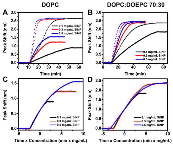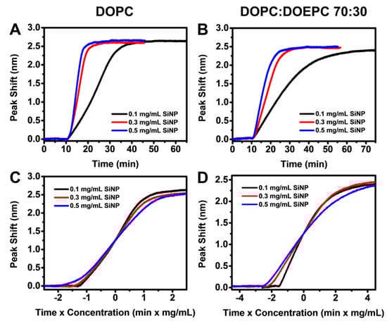 Localized surface plasmon resonance (LSPR) peak shifts as a function of time during the adsorption of silica nanoparticles (SiNP) onto: (A) DOPC; and (B) DOPC:DOEPC 70:30 SLBs. SiNPs were added at t = 10 min under continuous flow. The tested SiNP concentrations were 0.1, 0.3 and 0.5 mg/mL. Normalized responses from: (C) panel A; and (D) panel B scaled according to ct where c is the bulk SiNP concentration and t is time.