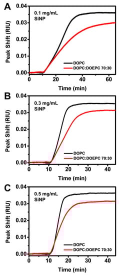 While the adsorption of bare SiNPs onto DOPC SLBs resulted in peak shifts of around 2.7 nm, the adsorption of BSA-coated SiNPs resulted in peak shifts of around 0.9 nm to 1.6 nm, depending on the nanoparticle concentration. These observations support that the interaction between SiNPs and DOPC SLBs can be inhibited by introducing a noncovalent protein coating around the SiNP. We then adsorbed BSA-coated SiNPs onto DOPC:DOEPC 70:30 SLBs. Compared to SiNP adsorption on DOPC SLBs, the difference in adsorption kinetics was less significant for all tested concentrations and the final saturation peak shifts were closely similar to the case of bare SiNPs at concentrations of 0.3 and 0.5 mg/mL, indicating comparable uptakes (Figure 5B). This finding is reasonable considering a stronger electrostatic interaction between negatively-charged BSA-coated SiNPs (considering BSA is negatively charged at physiological pH [115]) and positively-charged DOPC:DOEPC 70:30 SLBs, resulting in higher saturation peak shifts for all tested SiNP concentrations compared to the case of the zwitterionic DOPC SLB. It is also important to note that, for BSA-coated SiNPs, QCM-D measurements revealed variations in the frequency shifts that match the LSPR measurements for both SLB cases, suggesting a difference in the overall extent of mass uptake instead of mass distribution as in the case of bare SiNPs (Figure S6). Slightly lower final dissipation shifts observed on DOPC:DOEPC 70:30 SLBs also indicate a more rigid assembly of BSA-coated SiNPs.