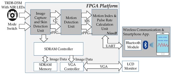 17], this paper focuses more on using motion detection algorithms to improve the robustness of contactless pulse rate and motion measurement. Furthermore, to overcome the illumination problem, we modified a camera with near infrared (NIR) LEDs to achieve better dark mode measurement. In consideration of the real-time application, a Field Programmable Gate Array (FPGA) SoC system was chosen to perform the proposed framework. In combination with Bluetooth communication technology, all the detected health information, comprising the instant pulse rate and motion status, can be transmitted to a smartphone for data display and collection in real-time.