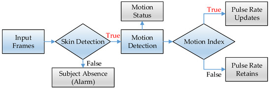 Figure 2 shows the data workflow of the proposed framework. The sequential image frames go through the skin detection algorithm. Frames containing less skin tone number than the setting threshold, are interpreted as indicating the subject is absent, and an alert signal is sent to the smartphone. Otherwise, the motion detection algorithm is performed to determine the subject’s motion status. To improve motion robustness, the motion index is proposed to preclude the distorted rPPG signal computation. The pulse rate is updated only when the motion index is true; otherwise, the pulse rate retains the same value from the last estimation.