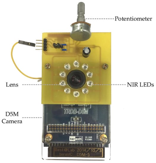 25]. To perform the method with the embedded system, we adopt 10 NIR LEDs (λ = 850 nm) to form a circular spotlight around the camera lens. The modified D5M camera can be seen in