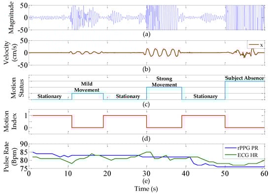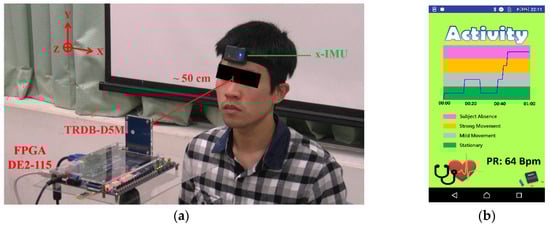 Figure 5a; the subject sits in front of the proposed system at a distance around 50 cm with indoor fluorescent tubes (T5) as the only light source. The smartphone is connected to the system via Bluetooth to collect and display the detected pulse rate and plot the changes of motion status as shown in