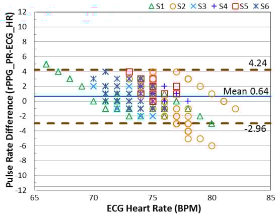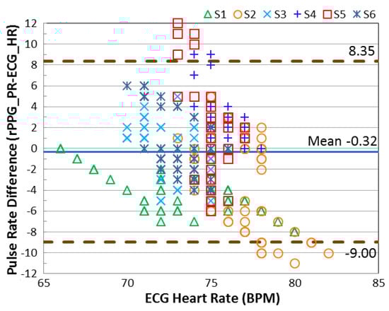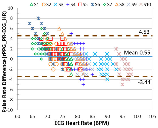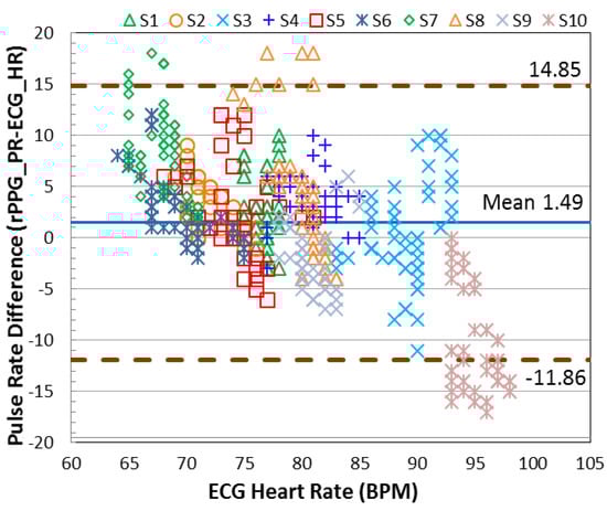 Figure 10 show the better agreement for the signal registered in the red color channel, which ranges from −2.96 to +4.24 beats/min. In contrast, the agreement degrades for the rPPG signal accessing from the green color channel, which is between −9.00 and +8.35 beats/min when the NIR lighting was used.