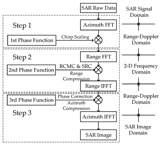 The flowchart of the CS algorithm is illustrated in Figure 1. First, the SAR raw data are transferred to the Range-Doppler domain via a FFT in the azimuth direction. Second, the data are multiplied by the 1st phase function to achieve the chirp scaling, which makes all the range migration curves the same. The 1st phase function can be described as: