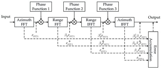 The CS algorithm processing flow can be summarized as a cascade of multilevel FFT/IFFTs. Figure 2 shows the error propagation model. Taking the quantization propagation progress of the first azimuth FFT as an example, define as the quantization error vector generated by the first azimuth direction FFT. βR and βA are the attenuation factors of the range direction FFT and the azimuth direction FFT, respectively. The quantization error is propagated through the latter range and azimuth FFT/IFFTs. The propagation progress of other FFT/IFFTs is similar.