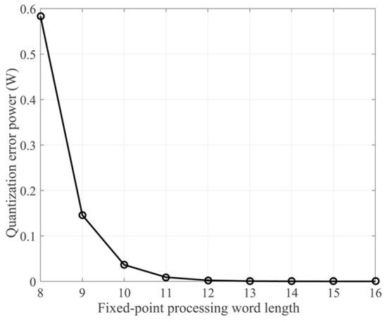 Quantization error power for different fixed-point processing word lengths.
