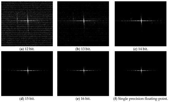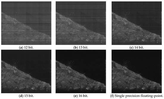 Figure 4 shows the point target imaging results for different FFT processing accuracies. Figure 4a–e are the imaging results of the partial fixed-point processing based on SystemC, which is a bit-accurate hardware design verification language [33]. Figure 4f is the imaging result of a typical single precision floating-point processing based on MATLAB (or some other conventional ground-based software processors). We choose the floating-point imaging result as the accurate one for comparison.