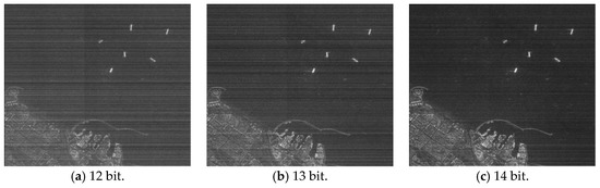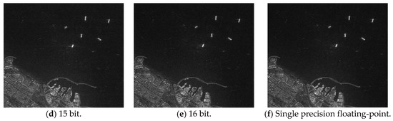 Figure 5 shows the actual scene imaging results for different FFT processing accuracies. The raw data were obtained from the Chinese Gaofen-3 satellite’s 50-km-width, 5-m-resolution stripmap mode. Usually, the region of interest (ROI) extraction, target recognition and other SAR image applications are performed after the SAR imaging process. Thus, we also selected some local regions in the actual scene to evaluate. Figure 6 shows the imaging results.