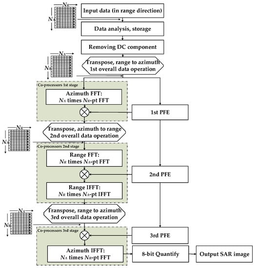SAR raw data are first accessed in the FPGA. Then, the standard CS algorithm can be partitioned into two parallel branches after the preprocessing operations, i.e., the raw data analysis and storage and the direct current (DC) removal operation. One branch, denoted by the grey, dashed rectangular boxes, is processed by the co-processors. The other branch, denoted by the solid-line rectangular boxes, is processed by the FPGA. The FPGA and co-processors are controlled by independent instructions. Thus, they can work synchronously. For the FPGA part, since the three-fold phase function estimation (PFE) can be classified as a linear combination of transcendental operations, the development can be improved effectively through using the IP cores provided by specific development tools such as Xilinx ISE. For the co-processors part, the order of the FFT (IFFT) and multiplication units is flexible and can be configured according to the algorithm requirements. The quantify operation should be added after the last azimuth IFFT to achieve the greyscale images.