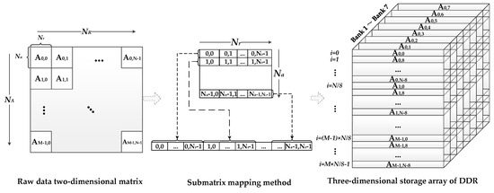 The FPGA, as the storage medium, establishes a data access link between the co-processor and external DDR SDRAM. In Figure 7, the left branch shows that three overall data reading and writing operations occur before the three co-processor processing stages. In general, the SAR raw data are stored range-first. Thus, three matrix transpose operations are required during the total processing procedure. The DDR-based matrix transpose is achieved by using the submatrix three-dimensional mapping method [39]. In this way, the transpose operation can be performed simultaneously with data reading before the co-processors stage. The accessing of situ address data is the prerequisite of this method. The main procedure of this technology is shown in Figure 8, according to the following two steps: