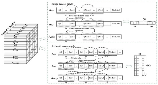 This mode corresponds to the overall data operation before the second co-processors stage. Take the first range reading operation line as an example. As shown in Figure 8, the data of this line are distributed into (0, 0) to (0, Nr-1) of the A0,0 to A0,N-1 submatrixes. These submatrixes are mapped into the A0,0 to A0,N-1 rows of the DDR. Since each of the m data belongs to the same range line, the range line data can be accessed from each row of the DDR continuously. Therefore, the data are accessed in sequential order, with m data per clock cycle. N row-cross operations and N/8 bank-cross operations are performed when acquiring one range line of NR depth. This brings an additional data access time overhead. Thus, it takes more than NR/m clock cycles to obtain one range line of NR depth. The range direction reading operation described above is shown in the upper part of Figure 9.