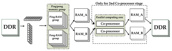Figure 9 shows the reading operation of the two modes from left to right. The writing operation has just the opposite procedure compared to the reading operation. Apart from the influence of the line-cross and bank-cross operations of each access mode, the maximum bandwidth utilization of the DDR also depends on whether the internal FPGA cache memory can match these two completely different access forms. The relationship between the memory and parallel accelerating technique will be discussed in the following subsections.