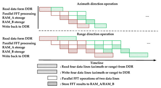 It is worth noting that there are both FFT and IFFT operations in the second co-processors stage, as shown in Figure 7. In this stage, Steps 2 to 3 should be executed once more before moving on to Step 4. The parallel processing timelines of one round-robin assignment for both the range direction operation and the azimuth direction operation are described in Figure 12. The red and green blocks represent the ping-memory-group-based operations and pong-memory-group-based operations, respectively.