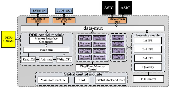 The system block diagram and the photo of the hardware system are shown in Figure 13 and Figure 14, respectively; it is mainly composed of one FPGA, two ASICs as co-processors and one DDR3 SDRAM. The FPGA design follows the modular design principle. A Universal Asynchronous Receiver/Transmitter (Uart) is used to receive the external control commands from the host computer for single-step debugging. The accuracy of each step of the CS algorithm can be verified in this way. The other main function modules of the FPGA include the following: