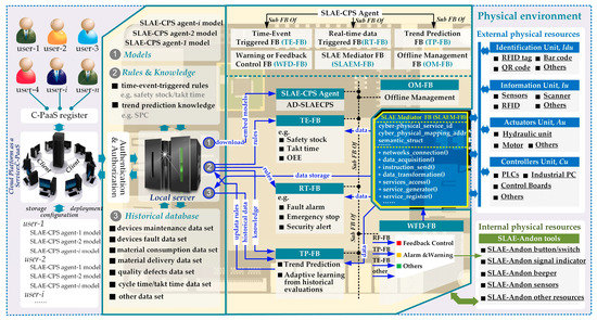 Classification of JDKSPA according to different time dimensions in Table 1 is shown in Figure 6. Triggering conditions of different JDKSPA are vividly expressed by partial “sample graph.” SLAE–CPS deploys different sets of JDKSPA in response to different demands. As shown in Figure 6, TERFTP-FB is equal to cyber-physical shell in the production system which executes Jidoka functions. This FB adopts heterogeneous data of the physical layer through SLAEM-FB and converts them into standard independent uniform services driven by protocols and hardware. On this basis, knowledge rules and abundant historical running data are collected from the SLAE server in the cyber layer, and corresponding Jidoka triggering rules are set and embedded into different types of FBs. Accordingly, integration of cyber and physical components is realized and dependency between traditional Jidoka application software and hardware is avoided. Therefore, SLAE–CPS application presents improved distributed characteristics. SLAE–CPS can be deployed either in local area through applications or at C-PaaS end through services.