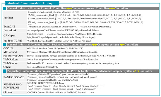 Data in a production system can be collected from heterogeneous sources across different production system levels. These sources include different physical resources (e.g., sensors, actuators, and controllers) and management information systems (MIS) (e.g., manufacturing execution system (MES), enterprise resource planning (ERP), product life cycle management (PLM), and product data management (PDM)). One of the first steps for production system management and control is to obtain heterogeneous data, and then uniformize and understand them. Some common Ethernet protocols (e.g., Profinet, TwinCAT, PowerLink, CANopen, and Modbus TCP/IP), communication technologies (e.g., OPC UA, MTConnect, and web service), and various proprietary protocols (e.g., FANUC FOCA 32 and Siemens 840D PowerLink) are developed to address the above-mentioned issues and integrate the data from heterogeneous hardware and software (Figure 3). However, a protocol is a set of rules for a particular type of communication, and different protocols often describe different aspects of a single or specific communication. Web service is usually used by enterprise service buses (ESB) to solve the coordination problem among different MIS, such as ERP, MES, PLM, and PDM. ESB is an integration infrastructure in the software industry and is realized through service containers distributed across a connected environment. To support SOA, the ESB service containers include all important web service technologies. If many different web service protocols, such as hypertext transport protocol, simple object access protocol (SOAP), and file transfer protocol, are to be used and standardized to a single protocol such as SOAP, the ESB can perform the necessary protocol transformation among the different MIS. This condition shows that ESB is an ideal backbone for implementing SOA at the MIS level. Apart from the interaction among different MIS, a seamless method that can manage the acquisition of data, the connection among various types of networks through various protocols and communication technologies, and the homogenization of heterogeneous data at the physical level is also needed [59]. SLAE–CPS is similar to a production system in that the standardization methods must be sought and implemented to support heterogeneity at the architectural and protocol levels [60]. Only in this way can SLAE–CPS achieve high-level functions, such as complex analytics and adaptive learning from historical evaluations.
