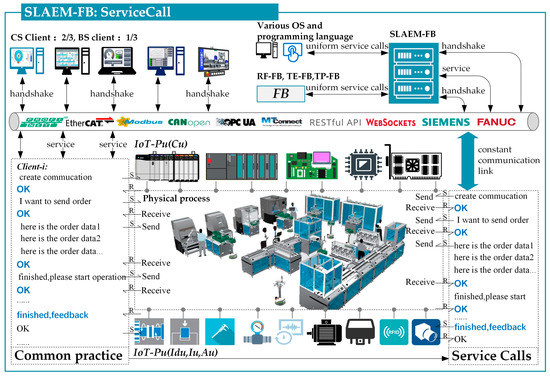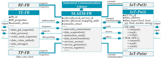 Therefore, this study proposes a service-oriented SLAEM-FB that is independent of OS type and programming language (Figure 4). The SLAEM-FB in this study can handle various network connections, heterogeneous data acquisition, and uniform data transformation (switch) at the physical level and provide CPS access to other FBs or even cross-level ESB. The service-call mechanism is shown in Figure 5. SLAEM-FB first creates a constant communication link with the IoT-Pu base in the communication library (OS APIs and web APIs). Then, a corresponding semantic service will be generated and registered by AD-SLAECPS. Each physical address needs to be monitored and added to the semantic service. Finally, according to the real-time requirement of data acquisition and processing in the SLAE–CPS agent application, some data will be pushed to other FBs (RT-FB, TE-FB, and TP-FB) immediately by the SLAEM–FB. Meanwhile, each cyber client can send requests to the SLAEM–FB and wait for a response.