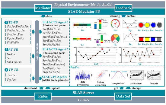 - SLAE–CPS Agent: The cyber-physical agent integrated with a hardware module and software component can access operating environmental data easily and execute poka-yoke (PY), anomaly detection (AD), trend forecast (TF), feedback (FED), and control and warning function (PY–AD–TF–FED function). An agent with independent communication, operation, and feedback control functions is called a SLAE–CPS agent. As an important component of the SLAE–CPS, the SLAE–CPS agent mainly consists of actuators for distributed SLAE–CPS scenarios (AD-SLAECPS) and six FBs with different functions, namely, SLAE-mediator FB (SLAEM-FB), real-time data-triggered FB (RT-FB), time-event-triggered FB (TE-FB), trend prediction FB (TP-FB), warning and feedback control FB (WFD-FB), and offline management FB (OM-FB).