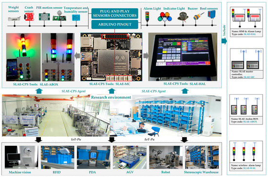 The developmental and experimental environment is shown in Figure 8. The region with black arrow is the IoT-Pu resource in the experimental environment, and the upper region comprises the SLAE–CPS tools integrating hardware modules and software component. According to the SLAE demands of different stations in the production system, the SLAE–CPS tools hardware kit is mainly divided into four classes.