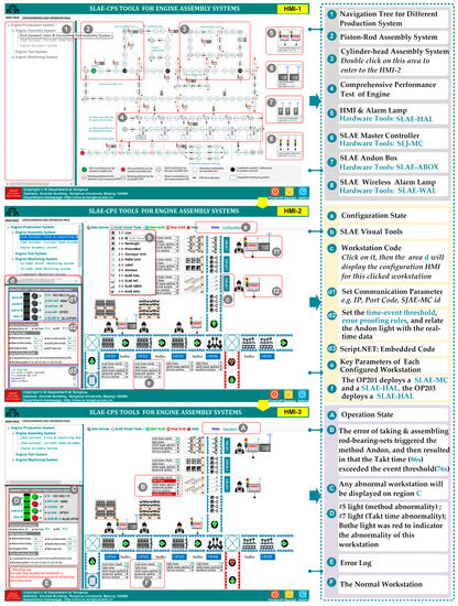 This project was implemented in 2012. As shown in Figure 7, in the piston rod assembly region for engine assembly system, some information units (e.g., proximity switches, photoelectric switch, operator safety barriers, weight sensors, torque and angle sensors, and RFID) are connected to one Jidoka PLC; thus, the resulting Jidoka is integrated. In recent years, embedded hardware similar with LattePanda, Arduino, Raspberry PI, and Up-Board are applied in industrial production to support various small distributed application scenes with the rapid development of IoT. With the application of preordered set and technology accumulation, the SLAE–CPS tools (hardware module and software component) that support distributed scene application are developed based on the proposed SLAE–CPS and experimental environment. The SLAE–CPS agent has been verified in laboratory. In the future, the SLAE–CPS tools will be used to update the completed projects and will be applied into new projects. The software component of SLAE–CPS tools is shown in Figure 9 and is mainly responsible for scene configuration of technological process in Figure 8. HMI-1 is the main interface of the system, HMI-2 is the interface for the SLAE–CPS scene configuration, and HMI-3 is the scene operation interface. The software component of SLAE–CPS tools is realized mainly by object-oriented GDI and technology and abstracting and packing desired elements in scene configuration into pixels. In addition, it realizes the desired knowledge rules by embedding various system operation logics and SLAE–CPS in pixels through the Script.NET technology. HMI-1, HMI-2, and HMI-3 are introduced in detail in Figure 9.