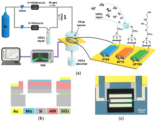 Volatile organic compounds (VOCs) are hazardous materials that have proven to have negative effects on the environment and human health. Concurrently, as sensitive biochemical markers, VOCs are widely used as analytes in the realm of environment protection [1], food testing [2,3,4], early diagnosis [5,6,7,8,9], and so forth. A successful platform for VOC detections is the electronic nose (e-nose) system [10,11] which consists of several sensors modified with different gas-sensitive materials. Numerous gas sensor types have been demonstrated to meet various measurement requirements. Gas sensors based on the metal oxide semiconductor possess a wide range of target gases with satisfactory sensitivity and selectivity, which makes them the most commonly used gas sensors [12]. Nano-size gas sensors, such as carbon nanotubes and graphene, can detect ultra-low concentrations of vapors due to their high surface-area-to-volume ratio [13,14]. Optical gas sensors benefit from the high fidelity of optical signals, making them suitable for remote detections [15]. Microwave gas sensors are emerging as cheap and label-free techniques, and the lack of selectivity can be overcome by combining with highly selective materials [16,17,18,19,20]. Among different types of gas sensors, MEMS piezoelectric gas sensors, such as surface acoustic wave (SAW) resonators [21], Lamb wave resonators (LWR) [22] and film bulk acoustic resonators (FBAR) [23,24,25] have triggered a lot research interest due to their low power consumption, micrometer-scaled sizes, and relatively high sensitivities. Compared with quartz crystal microbalance (QCM), however, they suffer from relatively low Q values, which may result in poor limit of detection (LOD), large phase noise, and instability when integrating with oscillating circuits.