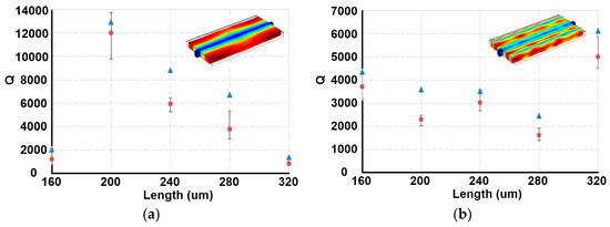 Simulated and measured Q values of PSBARs with different length. The width is 120 μm. Q values of (a) first order width-extensional mode (WE mode) and (b) third order WE mode. The triangle markers represent simulation results. The insets are the displacements of PSBARs at the first and third order WE modes.