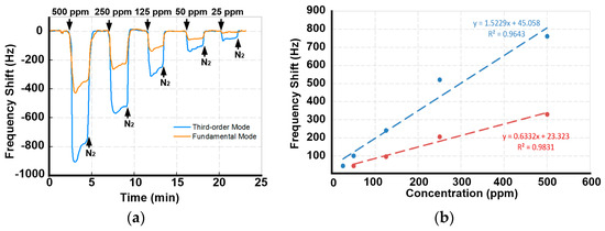 In order to compare the sensing capability of the first and third order WE modes, a PSBAR modified with BPTS was used to detect low concentration ethanol vapor. A 2000 ppm standard ethanol gas was prepared and connected to the VOC channel. By diluting the standard ethanol gas with pure nitrogen, 500 ppm, 250 ppm, 125 ppm, 50 ppm and 25 ppm ethanol gases were generated and detected sequentially with the PSBAR sensor. The real-time sensing results are shown in Figure 3a.