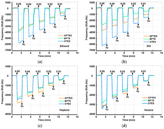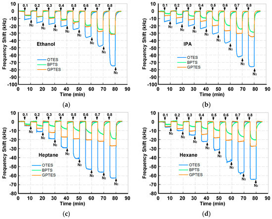 Figure 7 shows the real-time responses of the PSBAR array to four VOCs (ethanol, IPA, heptane and hexane). It clearly shows that the adsorption and desorption of VOCs on the SAM-modified PSBAR array are reversible processes, even at high gas partial pressures. Moreover, with the increase of the gas partial pressures, the amount of the VOCs’ adsorptions grows. Among the three SAM-modified sensors, OTES-modified PSBAR possesses the highest magnitude of responses when gas partial pressures are greater than 0.2, which may result from the longer chain length of OTES molecules. This effect is not obvious at low gas partial pressure due to the relatively low concentrations. With the increase of gas partial pressures, however, chain length becomes a dominant factor, which, together with the amphipathicity between VOC molecules and modified SAMs, ultimately contributes to the disparate responses of the three sensors. Moreover, it seems that when gas partial pressures are low, the adsorption responses do not follow exponential patterns. This might be due to the flow fluctuations of the gas sensing setup. The response time and recovery time were defined as the time required to change the frequency after exposure to VOCs or nitrogen in a specific range of 90%, as illustrated in Figure S7a. At 0.8 gas partial pressure, GPTES-modified PSBAR exhibits the shortest response time, while BPTS-modified PSBAR owns the longest response time. All the response and recovery times for VOCs at 0.8 gas partial pressures are given in Table S2. Additionally, during the measurement, the Q values of the PSBARs have relatively small fluctuations as shown in Figure S8, which ensures the high performance when integrating with oscillator circuits.