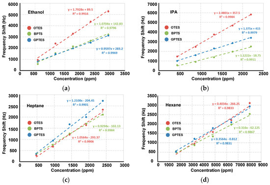 Linear fitting of sensitivities of three self-assembled monolayers (SAM)-modified PSBARs to (a) ethanol, (b) IPA, (c) heptane and (d) hexane. R2 is the correlation coefficient.