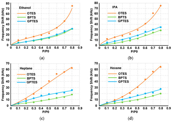 The adsorption isotherms of each VOC on different sensors can be obtained according to the frequency shifts at different partial pressures, as shown in Figure 8. It shows that the adsorptions of different VOCs fit different adsorption types according to their polarities, which is particularly obvious on the OTES-modified PSBAR. Brunauer-Emmett-Teller (BET) formula with finite adsorbed layers is used to fit the adsorption isotherms, which is the typical model of multilayer gas physical adsorption: