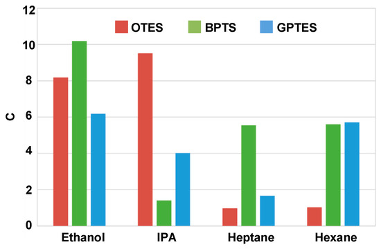 where t (°C) is the measurement temperature. A, B, C are empirical coefficient related to the detected vapors. By referring to the chemical handbook, the Ps of ethanol, IPA, heptane and hexane are calculated to be 36.48, 33.44, 36.48, and 121.6 mmHg, respectively. Therefore, the concentrations under 0.05 gas partial pressure of ethanol, IPA, heptane, and hexane are 2950, 2200, 2400, and 8000 ppm, respectively. The sensitivities of PSBARs to four VOCs can be depicted as Figure 5.