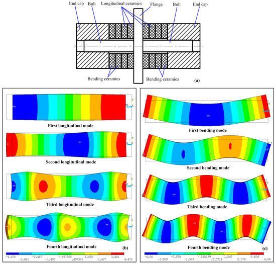 (a) The common structure of a sandwich transducer operating in longitudinal-bending hybrid modes; (b) longitudinal vibration modes of a beam with a square-shaped cross-section; (c) bending vibration modes of a beam with a square-shaped cross-section.