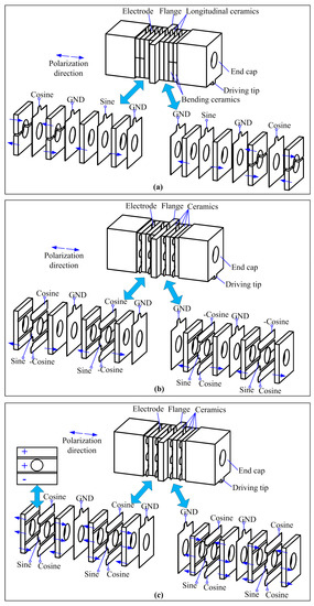 In Figure 2b, each piezoelectric ceramic plate has a uniform polarization direction on the three partitions, and the two neighboring ceramic plates have the reverse polarizations. Under these arrangements of the ceramic elements, three electrodes should be clamped between the neighboring ceramic plates, on which sine, cosine and -cosine signals are applied. The combination of the cosine and cosine signals can generate the second bending vibration as they may cause the anti-phase extension-shortening movements of the upper and lower partitions, respectively. The sine signal is used for the excitation of the first longitudinal vibration mode.