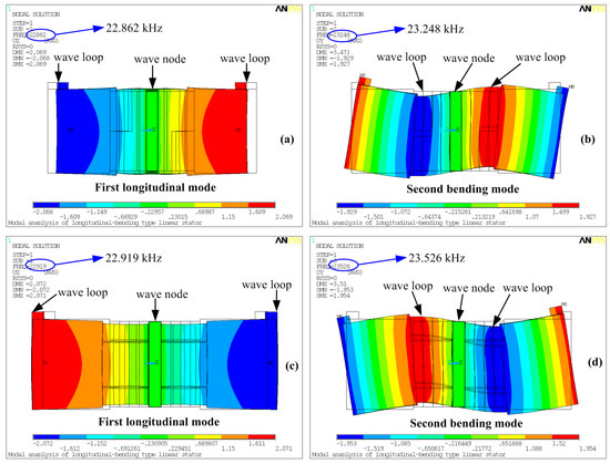 Modal analyses were then developed based on the two models, from which the resonance frequencies of the first longitudinal and second bending modes were gained, as shown in Figure 3. It can be seen that the two resonance frequencies rise slightly when the new exciting method is applied, and the discrepancy between the two calculated longitudinal resonance frequencies is about 57 Hz, while this value is about 278 Hz for the bending mode. These differences are mainly caused by the separation of three partitions on one piezoelectric ceramic plate in the new exciting method. The width of the center partition used for the longitudinal mode is 19 mm, the widths of the upper and lower partitions for the bending mode are 7.5 mm, and there is also a region of isolation with a width of 0.5 mm between the neighboring partitions, which is set with no piezoelectric effect.