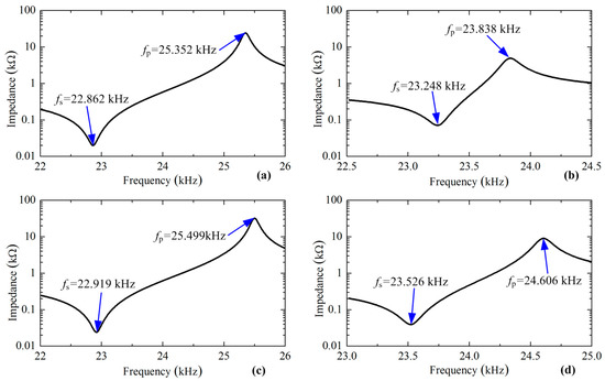 From Figure 3a,b it can be clearly recognized that the longitudinal ceramics are located near the wave node of the longitudinal mode, whereas bending ceramics are placed at the wave loop of the bending mode; these arrangements of the piezoelectric plates comply with the classic design rule of sandwich transducers [11,12]. The new exciting method changes the locations of the piezoelectric plates: the longitudinal ceramics are placed slightly away from the wave node of the longitudinal mode, while the bending ceramics are set away from the wave loop of the bending mode. These changes may have effects on the two vibration modes. Thus, harmonic analyses were conducted to calculate the input impedance of the vibration modes under different exciting methods. The results are listed in Figure 4, from which the series resonance frequency fs and the parallel resonance frequency fp can be obtained by recognizing the points with minimum impedances and maximum impedances, respectively. The electromechanical coupling factor k is calculated by the following equation [16]:
