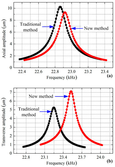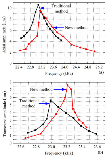 Figure 5a indicates that the transducer can achieve the maximum axial amplitude of 10.2 µm at a frequency of 22.862 kHz by using the traditional exciting method, while these two values change to 9.3 µm and 22.919 kHz when adopting the new method. From the amplitude versus frequency curves shown in Figure 5b, it can be seen that the maximum transverse amplitude is increased from 5.3 µm to 7.1 µm by using the exciting method shown in Figure 2c.