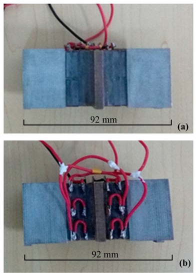 The electromechanical coupling factors and the vibration amplitudes of the transducers under the traditional and the new exciting methods were calculated by FEM (ANSYS software) to illustrate the differences. Firstly, two FEM models were built separately according to the arrangements of the piezoelectric ceramic plates shown in Figure 2a,c, respectively. The structural dimensions of the transducer are: total length of 92 mm, ceramic plate of 35 mm × 35 mm × 4 mm, flange of 55 mm × 35 mm × 4 mm and end cap of 37 mm × 37 mm × 27.5 mm. The material of the flange is bronze (mass density ρ = 8300 kg/m3, Young modulus E = 1.07 × 1011 N/m2, Poisson ratio σ = 0.37); the material of the end cap is duralumin alloy (mass density ρ = 2810 kg/m3, Young modulus E = 7.2 × 1010 N/m2, Poisson ratio σ = 0.33) and the material of the ceramic plate is PZT-4, whose physical parameters are: