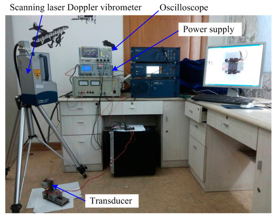 Two sandwich transducers were fabricated using the traditional and the new exciting methods respectively, as shown in Figure 6. Whole-piece type ceramic plates with three converse polarized partitions were used to build the transducer using the new exciting method. The parameters of driving force and speed are usually used to evaluate the mechanical output ability of a sandwich ultrasonic motor, but it was hard to evaluate the longitudinal and bending vibrations separately using these two parameters since these two modes always have different resonance frequencies. The vibration amplitudes of the driving tips under different frequencies were more acceptable for the comparison of the exciting method. Therefore, the vibration amplitudes of the driving tips were measured by a scanning laser Doppler vibrometer (PSV-400-m2, Polytec, Waldbronn, Germany). The experiment set-up is shown in Figure 7, in which the transducer was excited by a power supply with a frequency tuning function, and the vibration of the driving tip was measured and recorded by the vibrometer. The tested vibration amplitudes of the driving tips under different exciting frequencies and a fixed voltage amplitude of 100 V are shown in Figure 8.