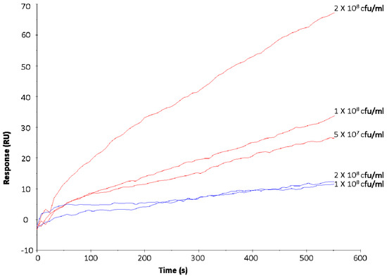 Increasing concentrations of Staphylococcus aureus DPC 5971 (red) and Escherichia coli O157:H7 P1432 (blue) injected over the surface of a streptavidin (SA) chip with mature LF immobilised to evaluate effect of increasing bacterial numbers on the response units (RU) response.